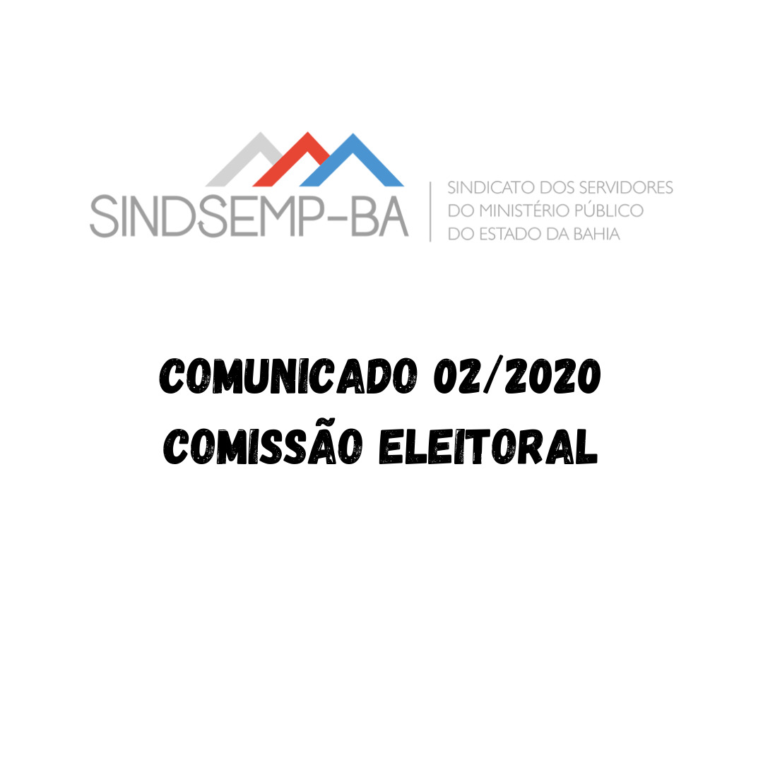 A Diretoria de Comunicação do SINDSEMP-BA, no uso de suas atribuição estatutárias, atendendo a pedido da Comissão Eleitoral, soberana nos moldes do Estatuto da entidade, PUBLICA o seguinte COMUNICADO 02-2020, oriundo da citada comissão:
