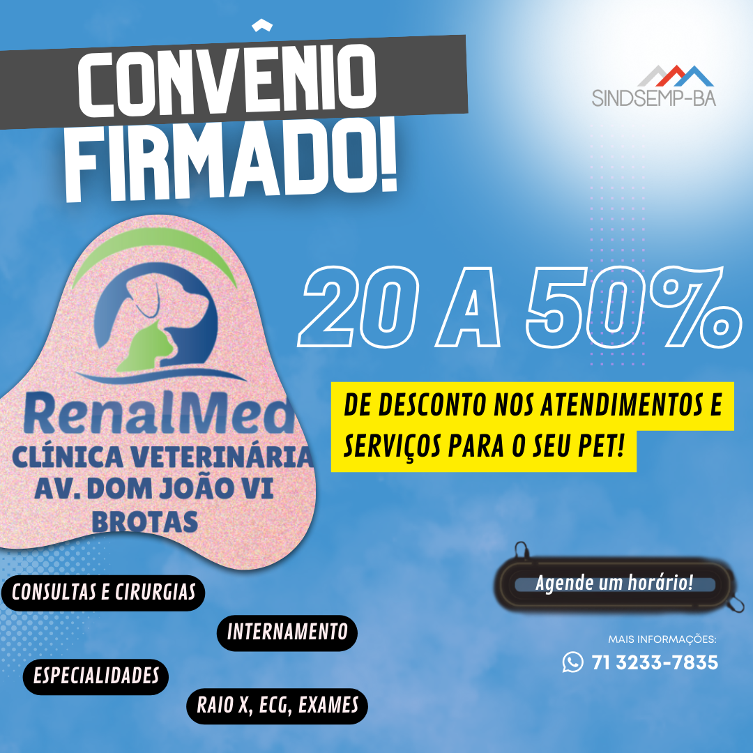 O SINDSEMP-BA acaba de firmar mais um convênio especial, garantindo descontos exclusivos aos seus filiados. A partir de agora, será possível obter descontos de 20% a 50 % em serviços de consultas e cirurgias, internamento, especialidades, exames de raio-x, ECG e muito mais na RenalMed Clínica Veterinária (Av. Dom João VI – Brotas). Clique aqui e confira a tabela completa com os valores especiais para os servidores filiados ao SINDSEMP-BA.